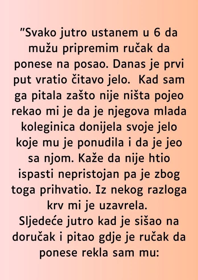 Svaki dan, dok se sunce polako diže, ja se budim ranije nego što je neophodno kako bih pripremila obrok za svog supruga. Ta rutina postala je neizostavni dio mog jutra, nešto što radim sa ljubavlju i pažnjom. Ova svakodnevna praksa ne samo da mu osigurava hranjiv doručak, već i jača našu vezu, pružajući mu osjećaj da je voljen i važan. No, današnje jutro donijelo je iznenađenje koje će promijeniti način na koji gledam na naš odnos.