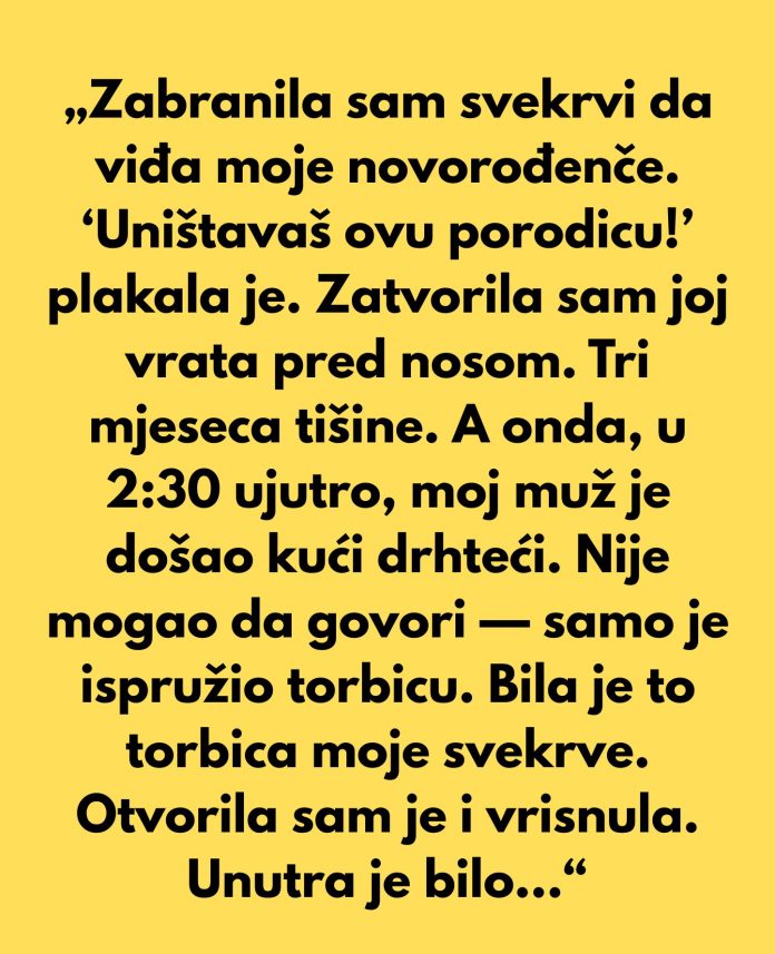 Međutim, sudbina je imala drugačiji plan. Jedne noći, muž se vratio kući nakon dugog dana, donoseći sa sobom torbicu koja je pripadala njegovoj majci. Njegova tišina i nervoza nisu prošli nezapaženo. Kada je mlada majka otvorila torbicu, unutra je pronašla ćebence za bebu koje je svekrva plela mjesecima. Na ćebencetu je postojala poruka koja je nosila težinu emocija: “Prešla sam granicu. Bila sam toliko uzbuđena što ću biti baka da sam zaboravila da si ti majka. Ovo je za onda kada budeš spremna.” Ova poruka je probudila snažne osjećaje u mladoj majci, koja je shvatila koliko je svekrvina namjera bila iskrena, i koliko je ljubavi bilo u tom poklonu.